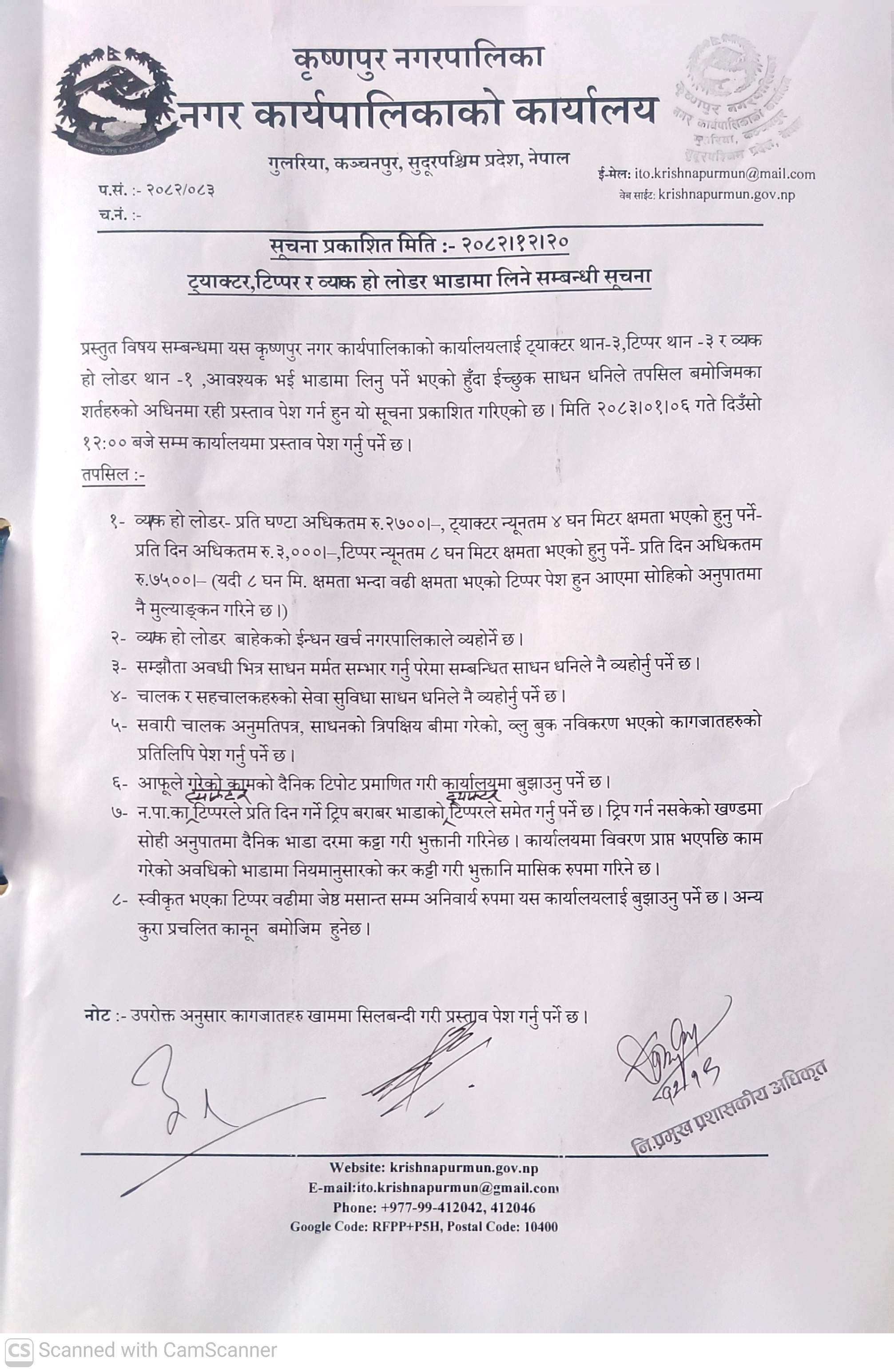 ट्याक्टर, टिप्पर, र व्यकहो लोडर भाडामा लिने सम्बन्धी सुचना