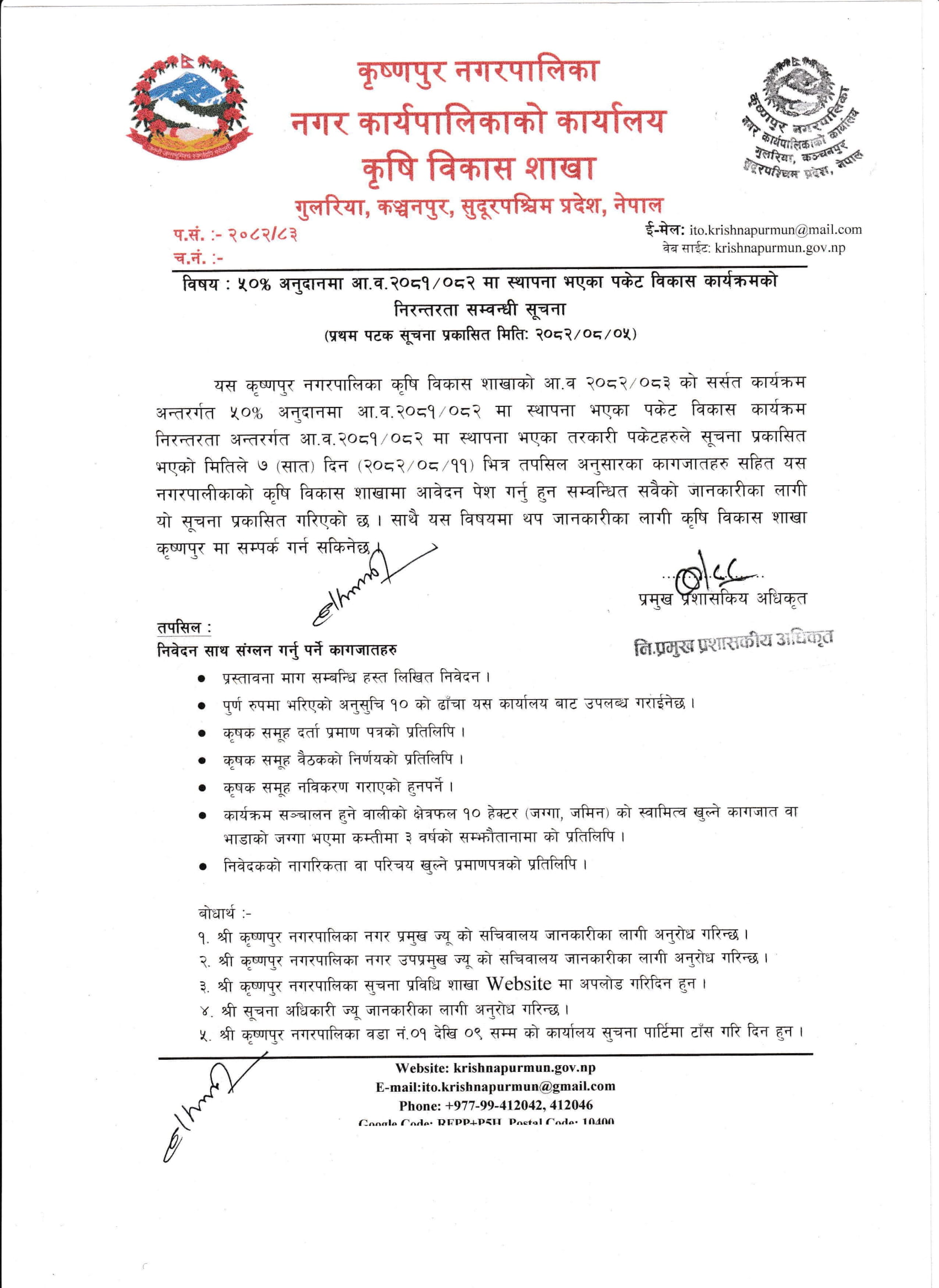 » ५०% आनुदानमा आ.व. २०८१/८२ मा स्थापना भएका पकेट विकास कार्यक्रमको निरन्तरता सम्बन्धी सूचना