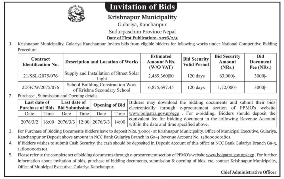 » सडक सौर्य बत्ति जडान र बिद्यालय भवन निर्माण सम्बन्धि बोलपत्र आह्वानको सूचना