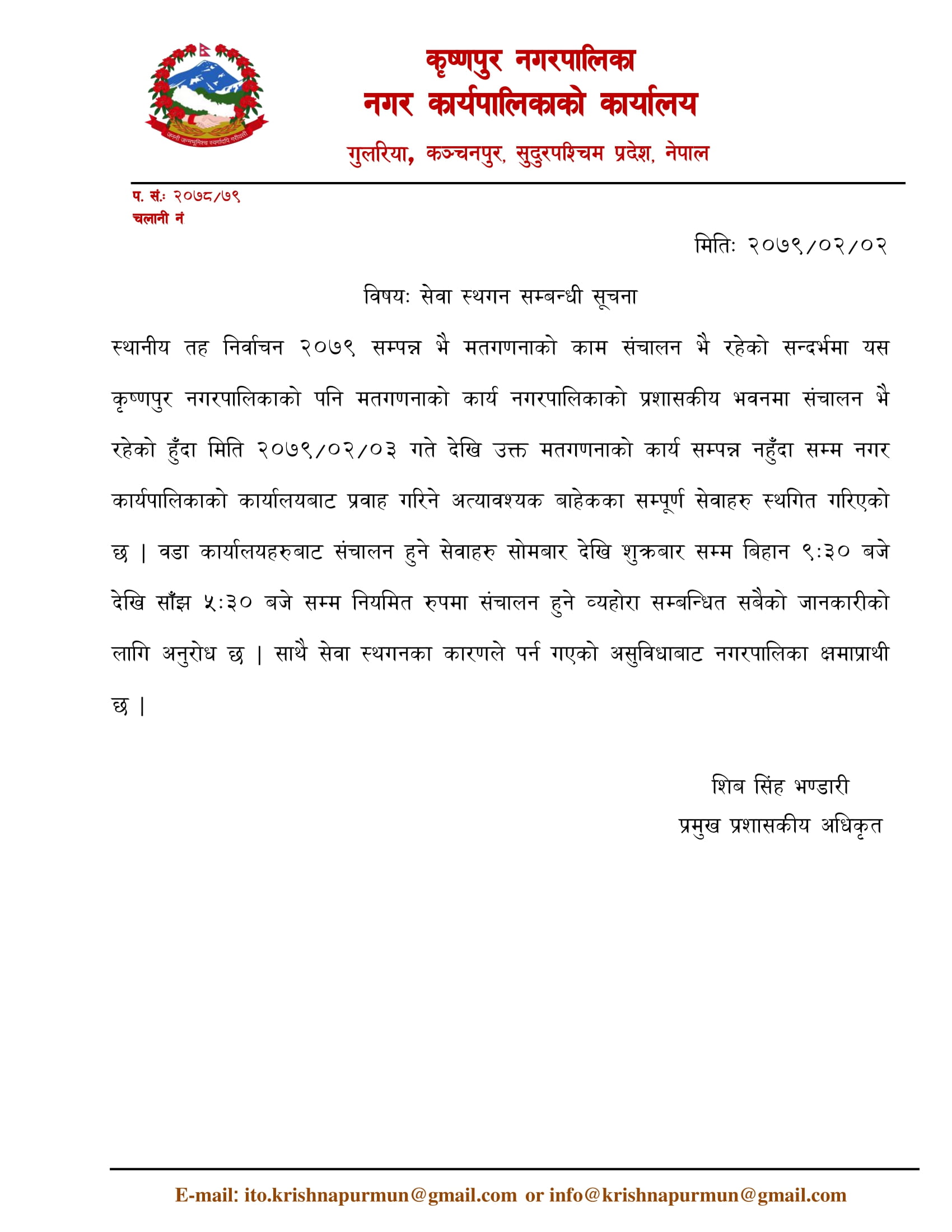 सेवा स्थगन सम्बन्धी सूचना