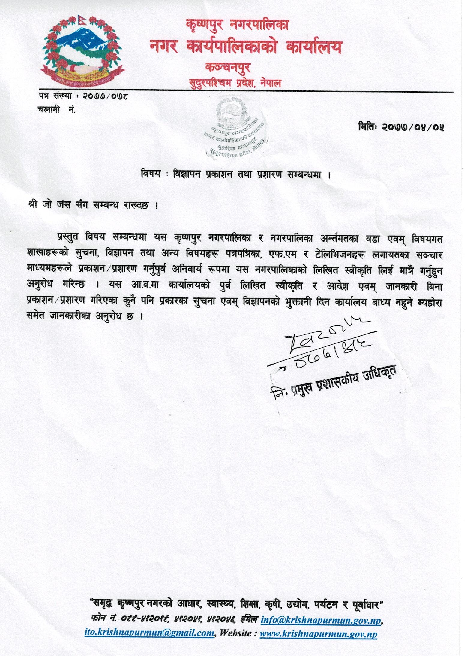 » बिज्ञापन प्रकाशन तथा प्रशारण सम्बन्धी सूचना