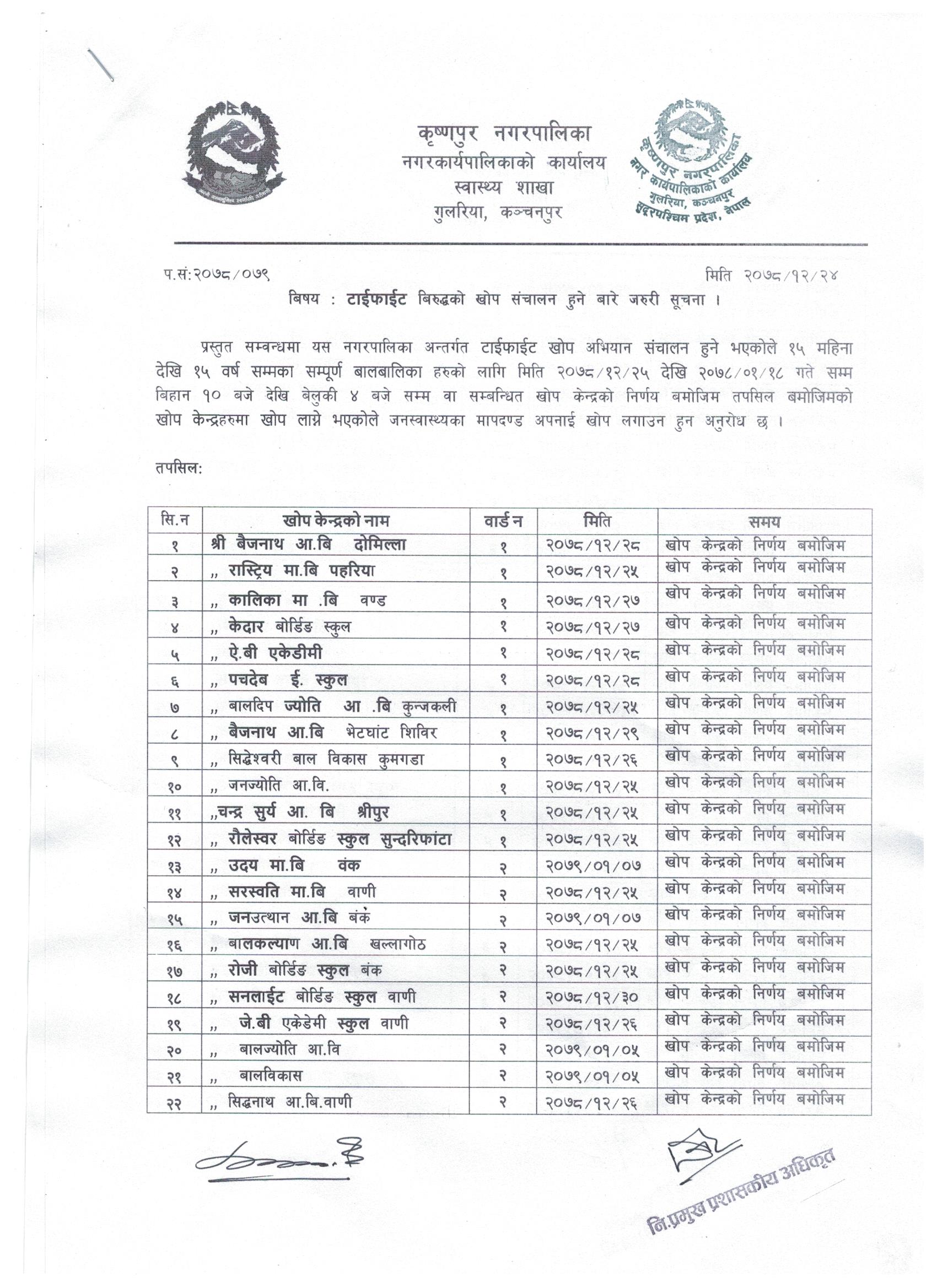 टाईफाईड बिरुद्धको खोप संचालन सम्बन्धमा