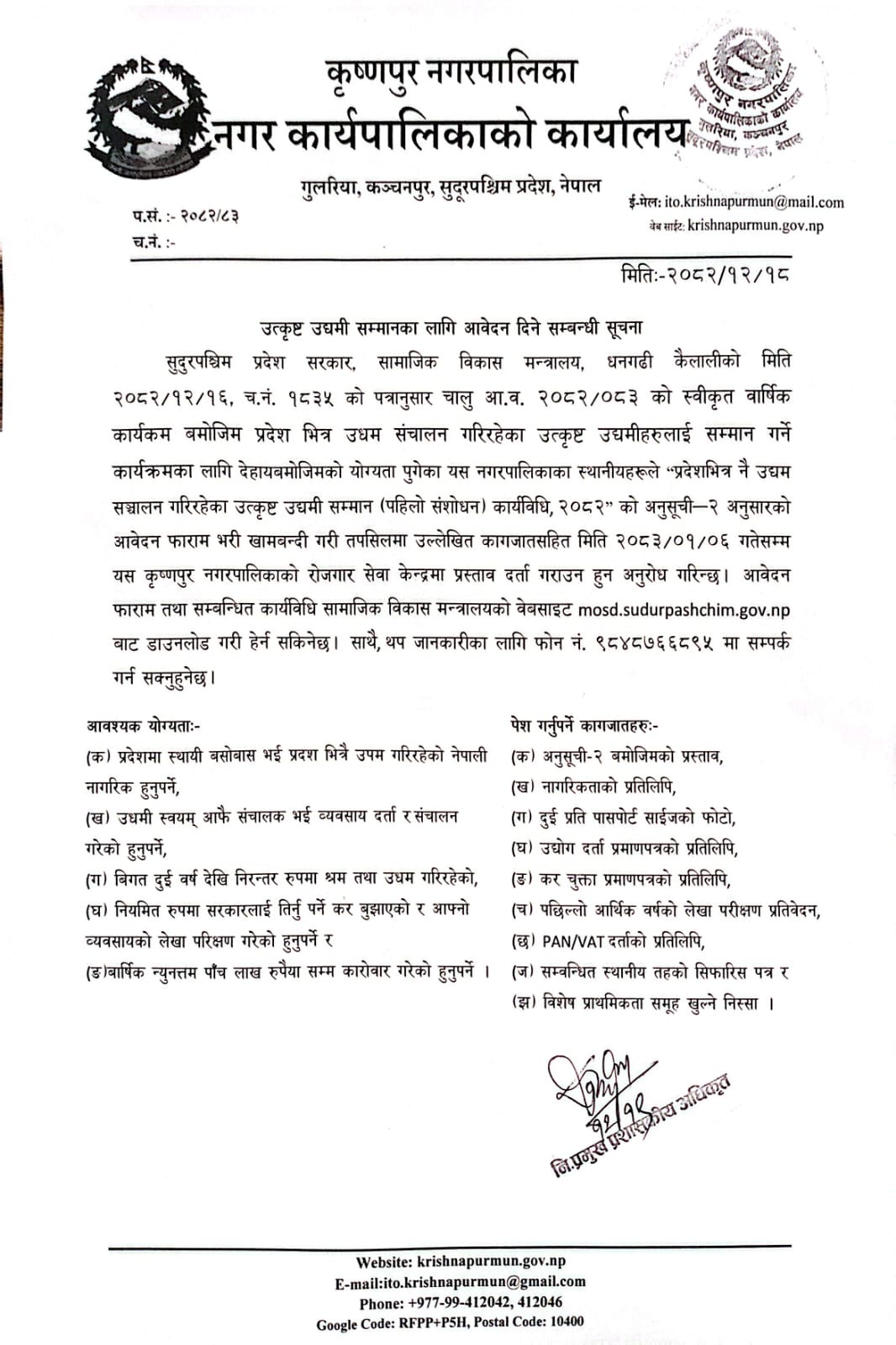 » उत्कृष्ट उधमी सम्मानका लागि आवेदन दिने सम्बन्धी सुचना