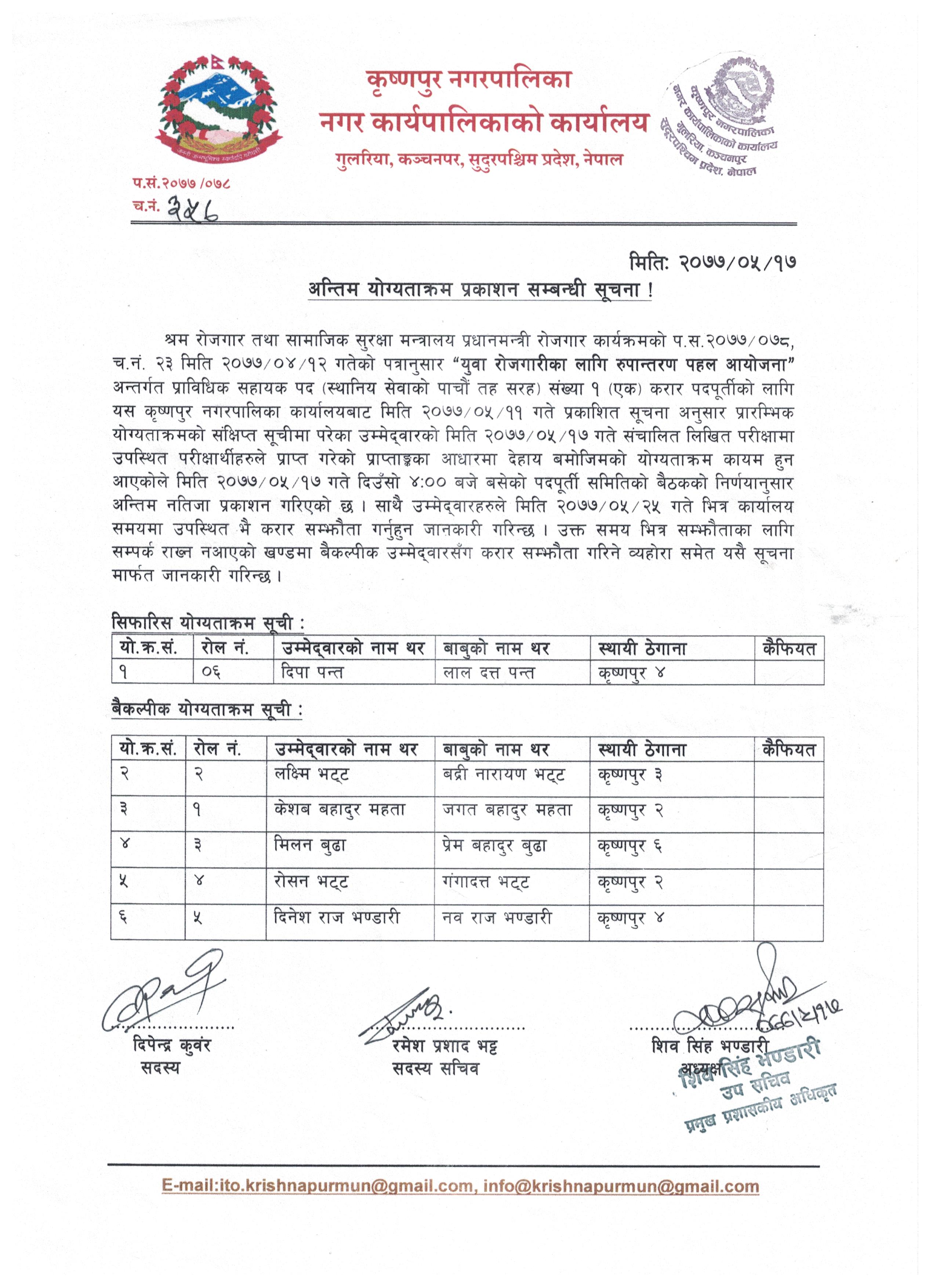 प्रविधिक सहायक पदको अन्तिम योग्यताक्रम प्रकाशन सम्बन्धी सूचना