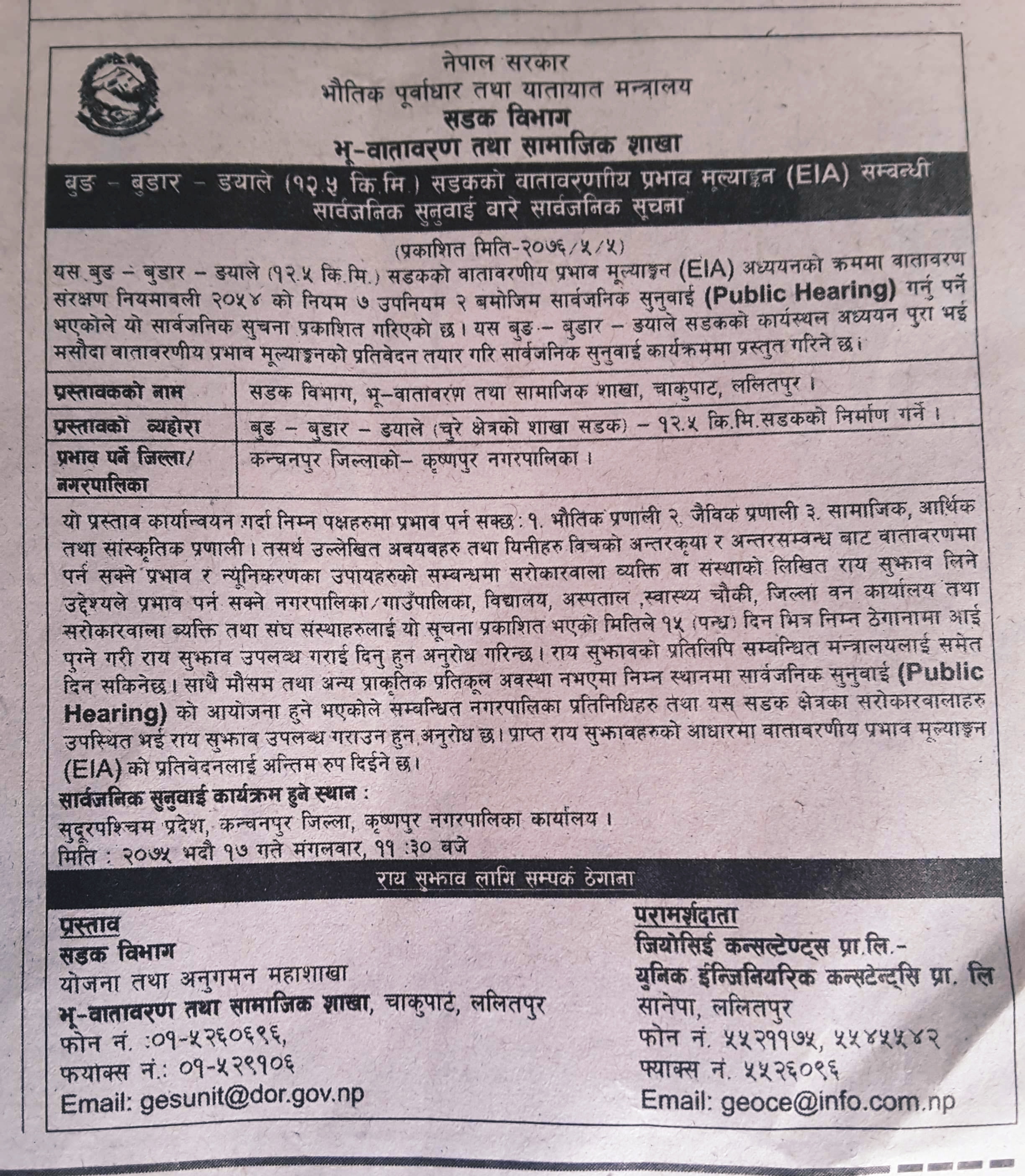भौतिक पूर्वाधार तथा यातायात मन्त्रालयको EIA सम्बन्धी सूचना