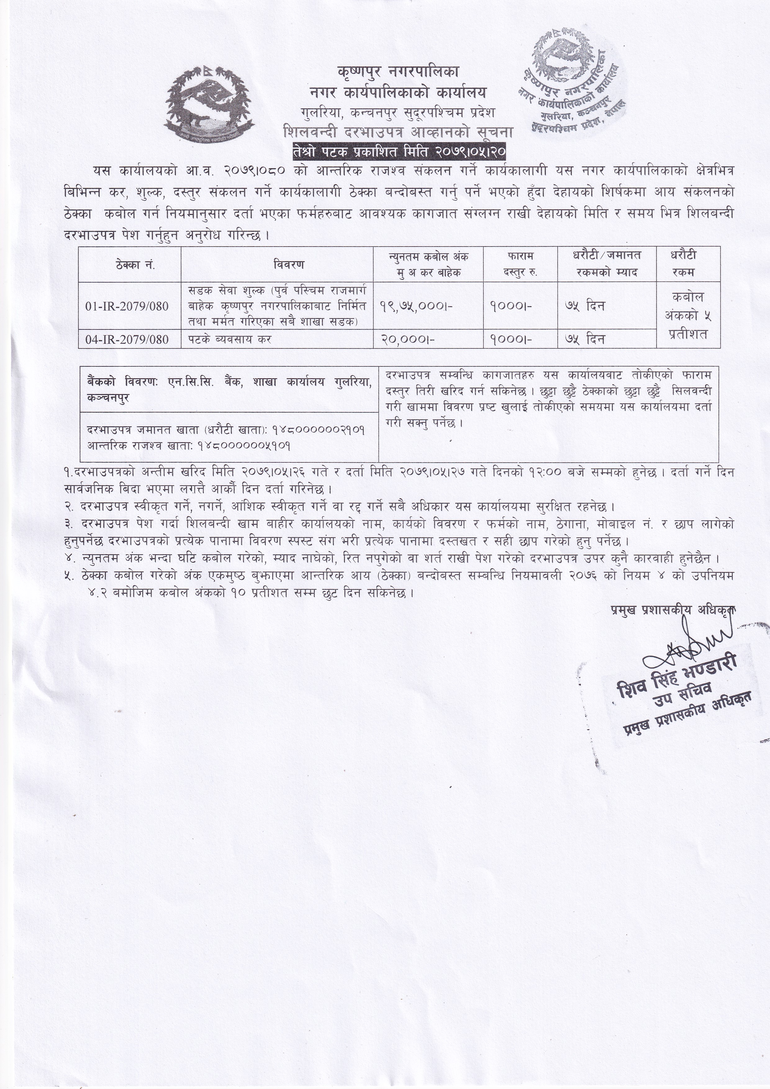 सडक सेवा शुल्क र पटके व्यवशाय कर सम्बन्धी तेस्रो पटक प्रकाशित दरभाउ पत्र आह्वाहनको सूचना